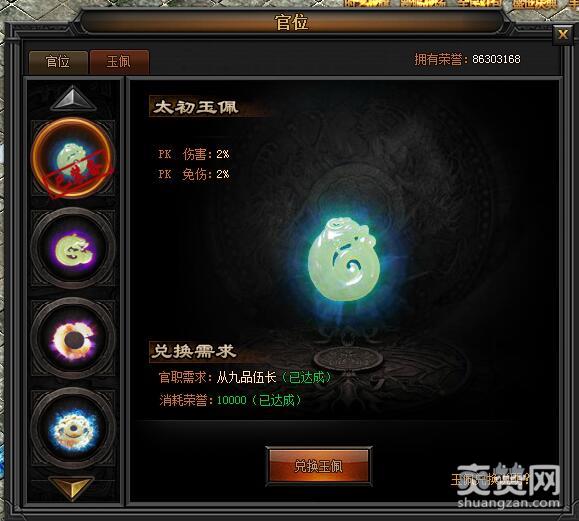 1.官职达到相应等级,可使用荣誉值兑换对应的玉佩。