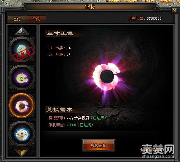 三才玉佩——PK伤害:6%,PK免伤:6%。兑换需要——官职需求:八品步兵校尉,消耗荣誉:40000。
