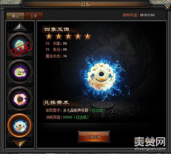 四象玉佩——PK伤害:8%,PK免伤:8%,魔法攻击:34。兑换需要——官职需求:从七品射声校尉,消耗荣誉:60000。