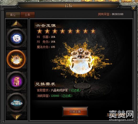 六合玉佩——PK伤害:16%,PK免伤:16%,魔法攻击:105。兑换需要——官职需求:六品和戒护军,消耗荣誉:120000。