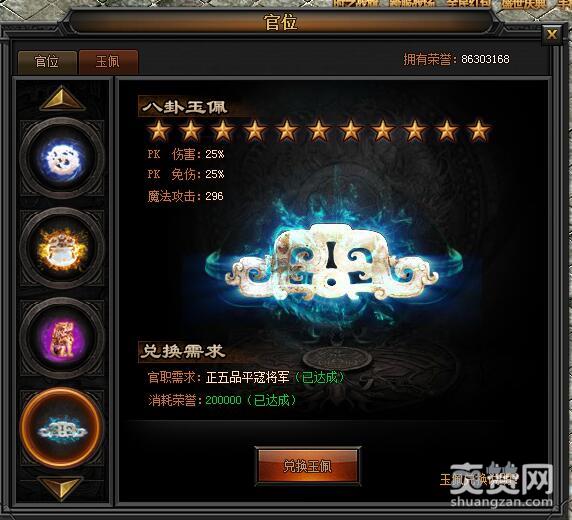八卦玉佩——PK伤害:25%,PK免伤:25%,魔法攻击:296。兑换需要——官职需求:正五品平寇将军,消耗荣誉:200000。