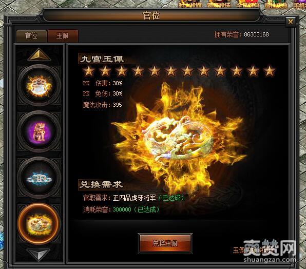 九宫玉佩——PK伤害:30%,PK免伤:30%,魔法攻击:395。兑换需要——官职需求:正四品虎牙校尉,消耗荣誉:300000。
