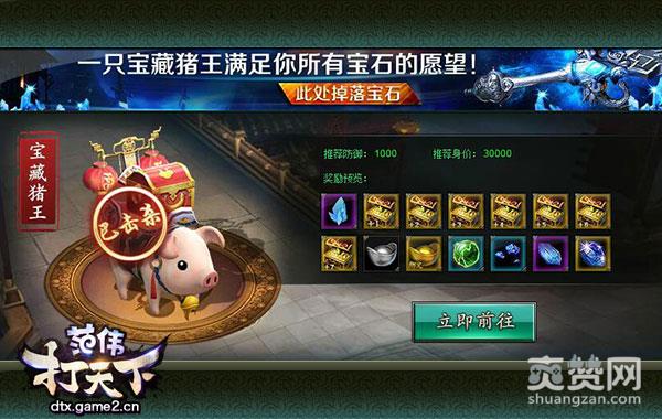 宝藏猪王掉落包括黄金宝箱、宝石碎片、绑定元宝、高级战翼强化石在内的稀有材料道具,而且宝藏猪王每小时刷新一次,只要玩家留意刷新时间,就有机会一睹宝藏猪王真容,拿下数不尽的宝石碎片!