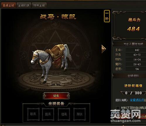 923yx《百战沙城》的坐骑系统在角色达到58级时自动开放,点击系统功能栏的“坐骑”即可打开坐骑界面。923yx《百战沙城》中的坐骑不仅造型拉风,还可以提升大家的相关属性,比如生命、防御、攻击等。