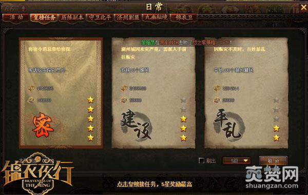 一星二星三星四星五星!皇榜任务以五星为佳。当你刷出五星时,此时的皇榜任务就是密探了,需要你一个人去秘密处理。当然所得的报酬也是丰厚的。在《锦衣夜行》中,玩家可以点击刷5星任务的设置,直到刷出秘密任务为止,每刷一次需要消耗一定数量的钱财,不过每完成一次的任务够你刷了。在任务结束之时还可以选择获得奖励的倍数,我想玩过的玩家都应该清楚,简直美滋滋。