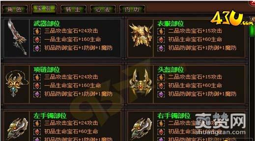 43u《赤月传说2》可镶嵌宝石的装备共有10件,分别是武器、衣服、左手镯、左戒指、鞋子、头盔、项链、右手镯、右戒指、腰带。达到指定的等级或转生等级达到指定的条件后,方可解锁宝石镶嵌装备栏。