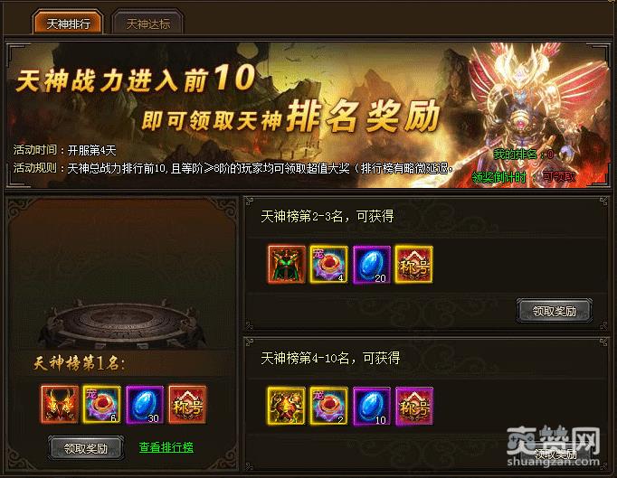 天神达标:开服第4天,天神等阶达标,即可领取丰厚奖励。