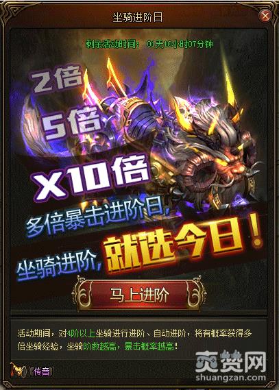 坐骑进阶:开服第1天至第2天,对4阶坐骑进阶或自动进阶,将有概率获得多倍进阶经验,坐骑阶数越高,暴击概率越高。