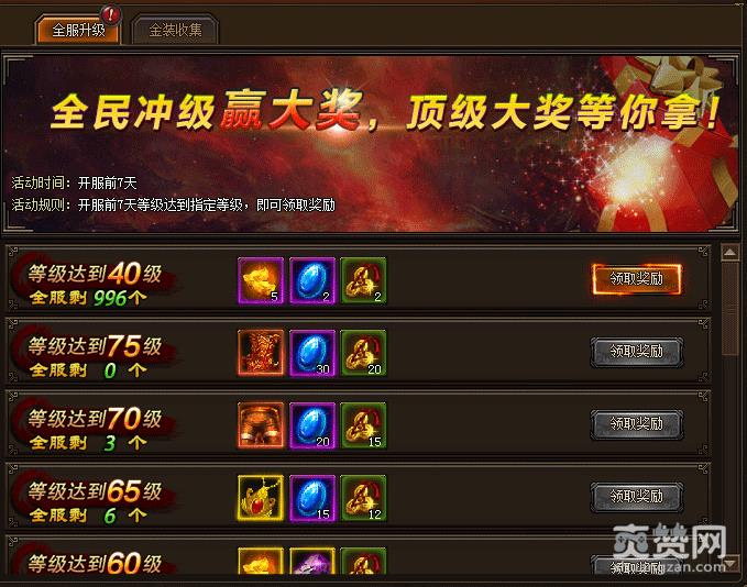 金装升级:开服前7天,金装收集数量达到指定要求,可以获得奖励。
