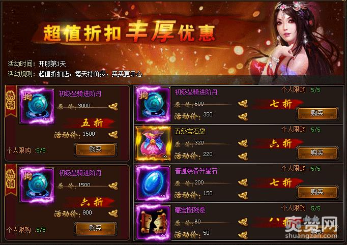 超值折扣店:开服前7天,每天逛逛超值折扣店,超低折扣限量优惠,特价产品售完即止,来晚就没有啦!