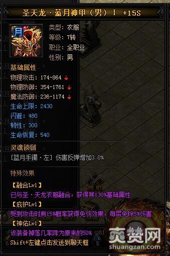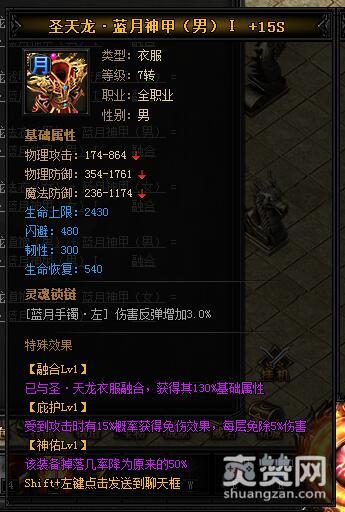 按照上述公式,就能合成圣天龙·蓝月神甲I,下面再让我们看一下它有哪些独特的属性和特殊效果吧。