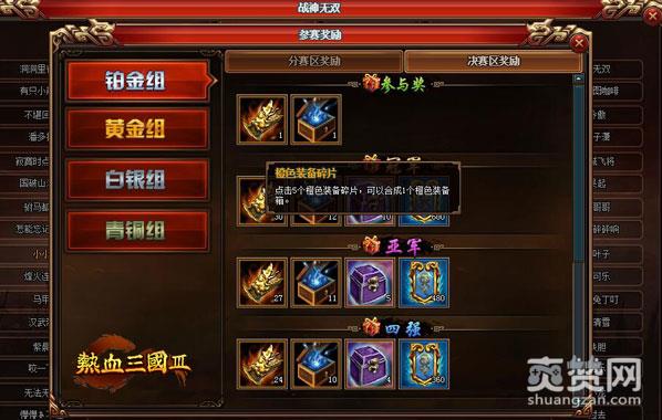 人人参赛,人人有奖。只要你报名参与战神无双不管输赢都可以获得参与奖。当然赢了最好,获胜者可以获得更为丰盛的奖励,5个橙色装备碎片就可以合成一件橙色装备哦。其余获胜者还可以获得神将或者神将碎片以及声望。参赛时间一般为周三周四,周六周日的下午三点。忙碌了一天,刚好可以放松下身心,叫上好友一起来排位吧!