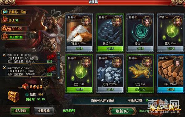 在《热血三国3》中除了战国无双等玩法还有其他一些有趣的活动。比如参加竞技场,跟不同的玩家进行PK以夺取对方的资源,不仅是粮食木材这些日常资源,还有战功,器灵等稀有的物品。当页面所显示的玩家物资不符合你要求或者他们的战斗力比你强时,你还可以通过刷新来更新。击败对方是有排名的,排名越高,排名奖励也是月丰盛。不仅如此,达到一定时间累积后还能获得宝箱奖励。