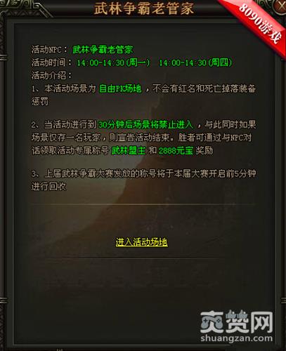 既然刚刚说到了皇城争霸那么想要成为武林盟主的小伙伴一定不会放过这个好机会的,在这个活动中场景仅剩一名玩家的时候活动就会结束了,胜利者可通过与NPC对话领取活动的专属称号武林盟主以及2888元宝奖励。