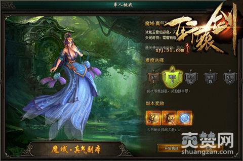 魔域副本和结界副本的模式基本是一样的,美人和战马都会跟随我们战斗。页面右侧会提示当前挑战的副本难度,以及通关之后获得的经验值,真气值奖励。