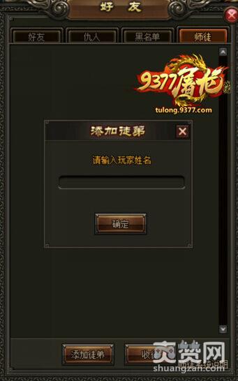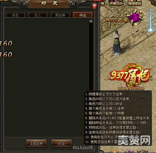 拜师/收徒方式在游戏中来说比较简单。玩家只要打开好友面板后进入师徒页面即可进行相关操作。在9377《屠龙战记》里,师徒页面下可以查看当前的拜师/收徒情况,也可点击拜师/收徒按钮进行拜师和收徒操作,界面中会显示当前地图内所有符合条件的玩家;玩家收徒/拜师后若对方同意则双方打成师徒关系成功。