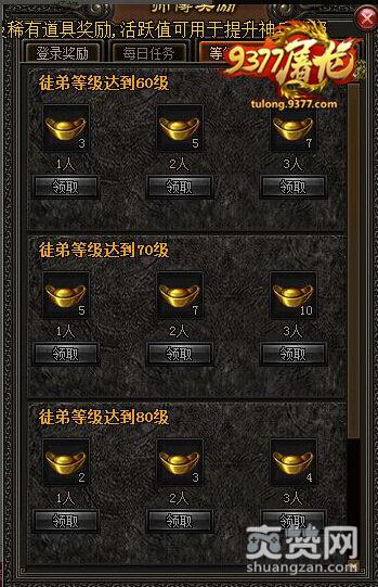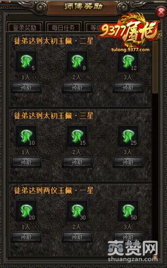拜师和收徒在9377《屠龙战记》里是有奖励的哦。小号拜师成功后,会邮件下发拜师奖励;而师徒收徒成功后,徒弟每日完成相应的操作即可在师徒界面领取相应的奖励。
