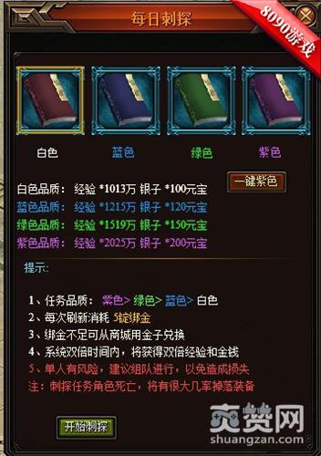 到达敌国王城后院,在流浪者处可以刷新任务品质,品质越高,奖励越丰厚,品质依次是白、蓝、绿、紫,每次刷新需要5锭绑金,当然,绑金不足的时候可以从商城用金子兑换,而在系统双倍时间之内,还能获得双倍经验和金钱。