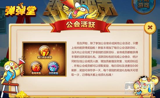 v8.8新版本开始,《弹弹堂》玩家除了参加公会使命或其他公会活动,只需要上线就能获取奖励!新版本增加了每日公会活跃目标,弹友们当天内完成多级别公会活跃目标,全体公会成员都能获得丰厚的奖励礼包。奖励最多可保存一天,并且每个级别的将领每天仅可领取一次,记得上线哦~