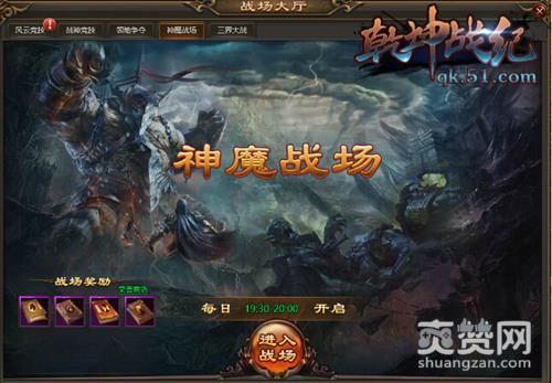 51《乾坤战纪》的神魔战场在每日19:30-20:00开启,人物等级达到45级,在活动期间打开“战场大厅-神魔大战”图标点击进入神魔大战地图,倘若迟于当天19:50后未入场的玩家将被取消当天参赛资格。进入战场之后,所有玩家将被系统随机分到两个阵营其中之一,而这种不确定的因数更是增加了活动的神秘感和刺激性。并且获得中获得的荣誉值还能在荣誉商城中用神魔大战荣誉值兑换各类珍稀道具和稀有技能书。