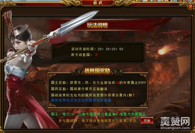 《帝王霸业》在每日晚上20:30分唐,宋,汉三国国王都会带领本国将士与敌国进行血战,经过半个小时激烈战斗,会产生胜者国,而战胜国国王可以获得5%战力加成。同时参与国战的官员与玩家也能得到丰厚的奖励。