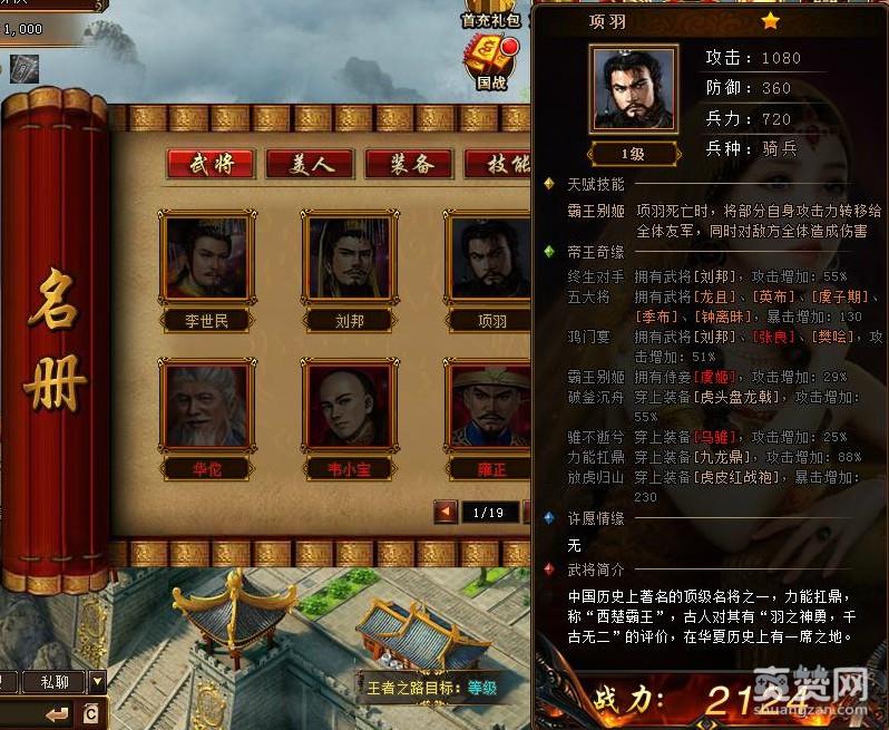 《帝王霸业》中还有比较罕见的暗金名将:【项羽】在历史上享誉很高,作为一名猛将,我们给项羽定位是输出,项羽的缘有八个,六个是攻击加成的缘,剩余两个是暴击加成。看着就很黄很暴力的项羽其实也有一颗易碎的玻璃心,他的不设防是硬伤,典型你不死我死,我死了,队友得利。项羽自带技能“霸王别姬”—项羽死亡是,将自身部分攻击力转移给上阵武将。为了突出项羽的特色,项羽的缘中,也没有防御或者兵力的缘,全是攻击和暴击的缘,就是为了让项羽能在上阵时间中打出足够的伤害。