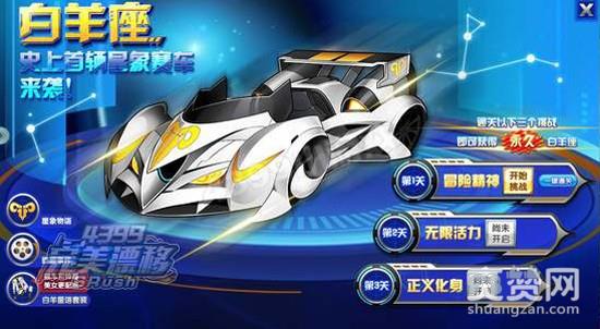 受战神阿瑞斯所庇护,拥有强劲马力,超强推进型赛车-----白羊座率先登场!通过它设下的三重挑战,就能让他成为你的伙伴,免费获得永久期限的白羊座赛车哦!快来挑战星象赛车的试炼吧!