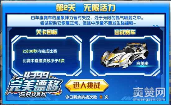 第二关:无限活力,在2分30秒内完成比赛,并且比赛中碰撞次数小于5次,如果达到了5次,可以花费15钻满血复活哦!本关地图为梦幻秘境。本关一键通关,需要花费钻石*398。