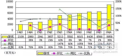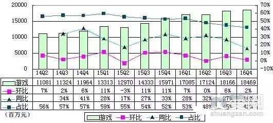 腾讯游戏依然是腾讯最大的收入来源,不过,腾讯游戏在营收中占比在持续下降,从2014年第二季度的占比56%已下降到2016年第四季度的42%,下降了14个百分点。