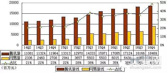 到2016年第四季网易游戏营收占腾讯游戏营收的49%,很快会突破50%关口。