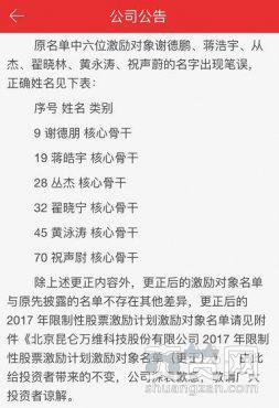 昆仑万维又紧急发布了《关于2017年限制性股票激励计划激励名单的更正公告》。刚看到题目的时候爽赞小编还在想,难道昆仑万维难道后悔要发这么多股票?或者是昆仑万维感觉发少了要追加?然而,点开之后才发现原来是写错了6位核心骨干的名字。