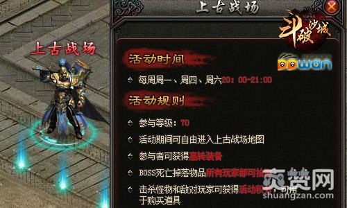 上古战场是ppwan《斗破沙城》中的限时特色对战玩法,每周二、周五20:00-21:00开启!活动期间,70级级以上的勇士就可以通过上古战场使者进入上古战场。首次进入场景,系统将会随机分配玩家到对战的双方阵营。在这里,为自己所在的阵营而战就是自己的使命,在这里,无尽的厮杀是这里的常态直到大战的终止。
