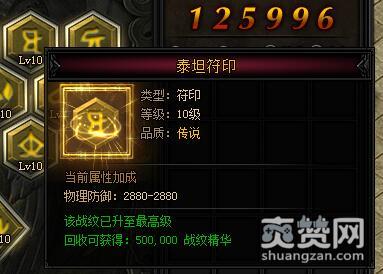 泰坦符印。类型:符印,等级:10级,品质:传说。当前属性加成——物理防御:2880-2880。该战纹已升至最高级,回收可获得:500000战纹精华。