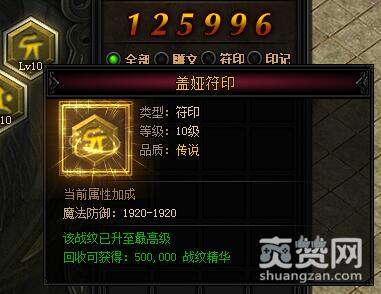 盖娅符印。类型:符印,等级:10级,品质:传说。当前属性加成——魔法防御:1920-1920,该战纹已升至最高级,回收可获得:500000战纹精华。