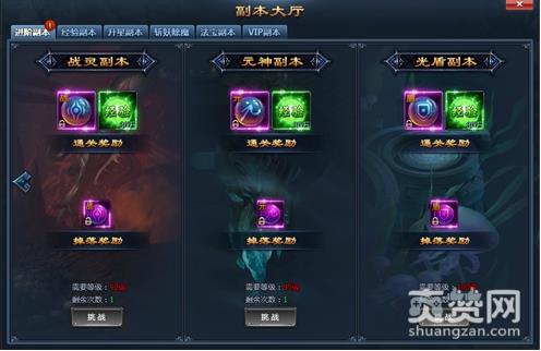 接下来是副本大厅中的副本,可分为进阶副本,经验副本,装备副本,斩妖副本,法宝副本和VIP副本