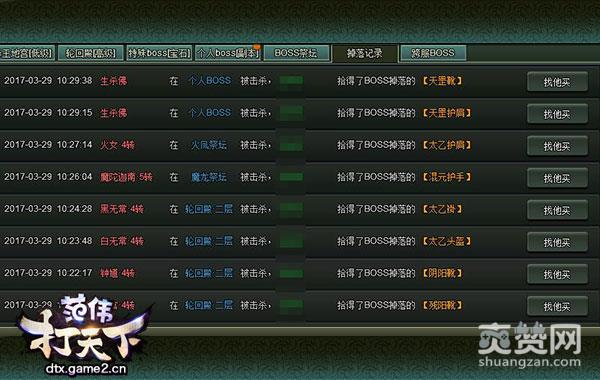 我们可以在BOSS界面看到掉落纪录,这里记载了BOSS在什么时间什么地点被哪位玩家击杀,玩家们就可以在这个界面向装备所有权的玩家购买稀有装备。掉落纪录间接为玩家们提供了一个交易的平台,让玩家们之间互取所需!