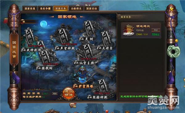 在360uu《乾坤战纪》之内,强大的国家怎么能少得了富丽堂皇的宫殿,仙宫玩法就此推出,所有国家的子民们都将能够拥有一座共享的仙宫作为国家领地,在仙宫内,分为摇钱树、点将台等众多建筑,在这里每天玩家都能够领取到丰富的奖励,当然仙宫的壮大也需要玩家们共同建设。在当前版本中,玩家们可以通过完成国家任务来帮助仙宫完成建设,通过捐献资源获得功勋,与服务器内的众人们一起,建设属于你们共同的仙宫!