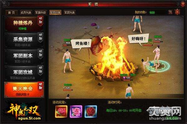 51《神鬼无双》篝火晚会在每晚19:00-23:00期间,由军团官员自主开启。活动过程中,玩家可进行烤鱼,根据鱼类的不同,完成烤鱼后获得相应的经验。别小看这小小的烤鱼,这些鱼都是玩家在军团活动中自己垂钓得来,与亲密的人分享自己的劳动成果,幸福也不过如此了吧!