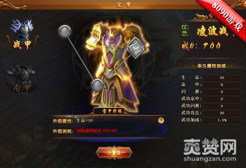 行走在江湖的冷风中,没有一件炫酷的宝甲怎么行?衣服行头太掉价不符合大侠的style,请各位玩家打开8090热血江湖传的宝甲界面,这里有战甲和内甲两个宝甲,两个宝甲提升的战斗力大同小异,可以提供生命、命中、闪避和防御等永久属性的加成,对于提高战斗力的帮助很大。
