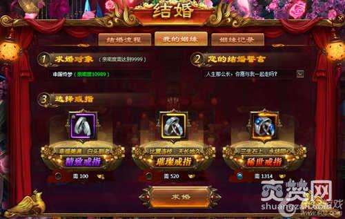 现实中的求婚女神一般都要求有房有车,在602《乾坤战纪》中,只需要给女神准备一个亮瞎眼的豪华大钻戒就OK了,求婚后,女方将看到求婚页面,同意求婚则进入婚礼预约步骤,拒绝求婚则很遗憾错过本次姻缘咯!