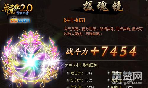 摄魂镜乃先天灵镜,镜分阴阳,阳铸其体,阴成其魄,镜光可收敌人魂魄,万难脱离。在ppwan《莽荒纪》中,摄魂镜可永久为玩家增加攻击力、防御力、气血值、命中值、暴击值等七大属性,增加战斗力高达7457,可主动对玩家发起攻击,使目标陷入晕眩状态,持续3秒,并附加无视防御时光伤害!