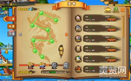 遁甲天书包含:人遁、地遁、天遁,并且按玩家的等级解锁.激活遁甲天书需要消耗领悟点,领悟点通过领取天书活跃度宝箱获得.激活遁甲天书可以获得大量属性,但是遁甲天书需要按顺序激活.激活天书之后,对玩家的战力会有一个很大的提升.
