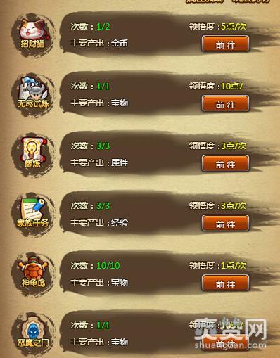 完成天书任务就可以领取天书的活跃度宝箱了.天书里面包含的任务对玩家而言都是每日必做的任务.招财猫、副本、修炼、扭蛋机、家族任务、恶魔之门、冒险挖矿、阵营战等零零总总的任务,不管是休闲玩法,还是pk玩法都应有尽有.玩家做完这些任务就可以得到领悟度,领悟度积累到25、50、75、100就可以领取天书的活跃度宝箱了.
