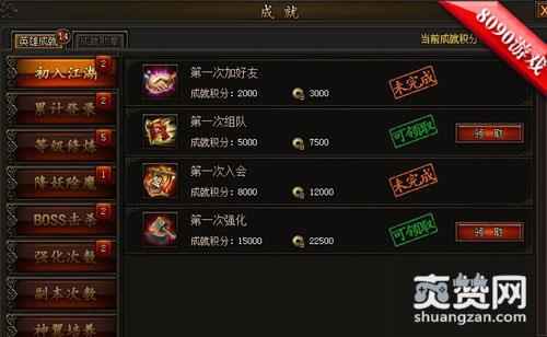 首先就是英雄成就的领取啦!在成就界面中会有英雄成就,其实在玩游戏的过程中,不知不觉得就会达成很多成就,英雄成就中又分为初入江湖,累计登陆,等级修炼,降妖除魔,boss击杀,强化次数,副本次数,神翼培养等成就,例如第一次加好友会有成就,组队,入会,强化,都会有成就。