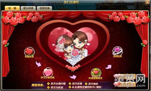 彼此认识之后,就可以进行婚姻前的准备了.只要玩家满足了以下几点就可以结婚了,双方达到40级,双方在线,双方组队,双方为好友,队长拥有足够的钻石或者绑钻.婚前准备很简单,准备好了之后,玩家就可以进入婚礼殿堂了.