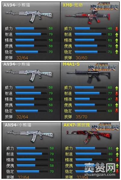 和XM8炫动相比,虽然XM8炫动在射速、精确、稳定、便携上都胜过AN94小熊猫,但威力太低,实战中没有什么伤害能力。与M4A1-S对比,AN94小熊猫比M4A1-S在威力和便携上略逊一筹,但其他属性都完爆M4A1-S。和AK47-黑玫瑰相比,AK47-黑玫瑰在便携、威力、射速上略胜一筹,但毕竟AK47类武器稳定性都太低,所以压枪压不好的小白尽量选择AN94-小熊猫。