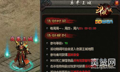 当夜幕开始降临,大地被黑暗笼罩,即每周一、四、六的20:00-21:00,黑夜的暗杀者们开始磨刀霍霍,准备向王城进发。在ppwan《斗破沙城》中,只要等级达到70级,都可以在九洲城的夜袭王城NPC处进入夜袭王城的地图,成为暗杀者中的一员!