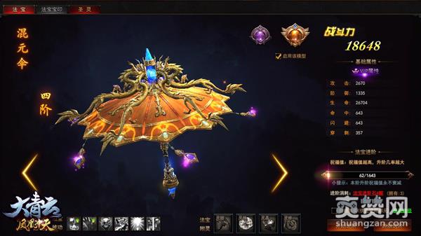 法宝每个修行之人贴身必备的装备,它能够随着主人的历练而不断成长。游戏开服的第二天,法宝系统便会自动开启。在法宝系统中包含法宝、法宝宝印和圣灵三部分。在《大青云》里,法宝共分为14个阶段,即:七宝玉镜瓶、番天印、神农鼎、混元伞、资金葫芦、七宝玲珑塔、九龙神火罩、山河社稷图、天地宝镜、万象降魔杵、玲珑莲花灯、炫目时光轮、风火落魄钟、四翼追魂钉。装备法宝可以为角色提供全属性战力加成,使玩家在战斗中占有强有力的优势。
