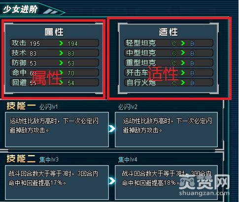 艺术巴山《战车少女》中少女有5种属性可供玩家选择提升在战车附加属性上,分别是攻击、命中、技术、回避、防御。作用各不相同,搭配也千变万化,可衍生出数不尽的战术,这些属性共同决定了玩家的战斗力。不同资质的少女不仅在技能属性上占有优势,而且在后期培养,不同的品质的少女的属性有很大的差异。任何资质的少女都可以通过进阶升级军衔,高品质的少女经过进阶以后,才可称为强大的少女。