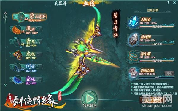 《剑侠情缘兵器谱》兵器谱系统包含兵器谱、血炼和自定义技能。在兵器谱界面里可以查看游戏中的所有兵器,玩家还可对已激活的兵器进行升品、提升熟练度、升级技能、精炼等提高永久属性值。